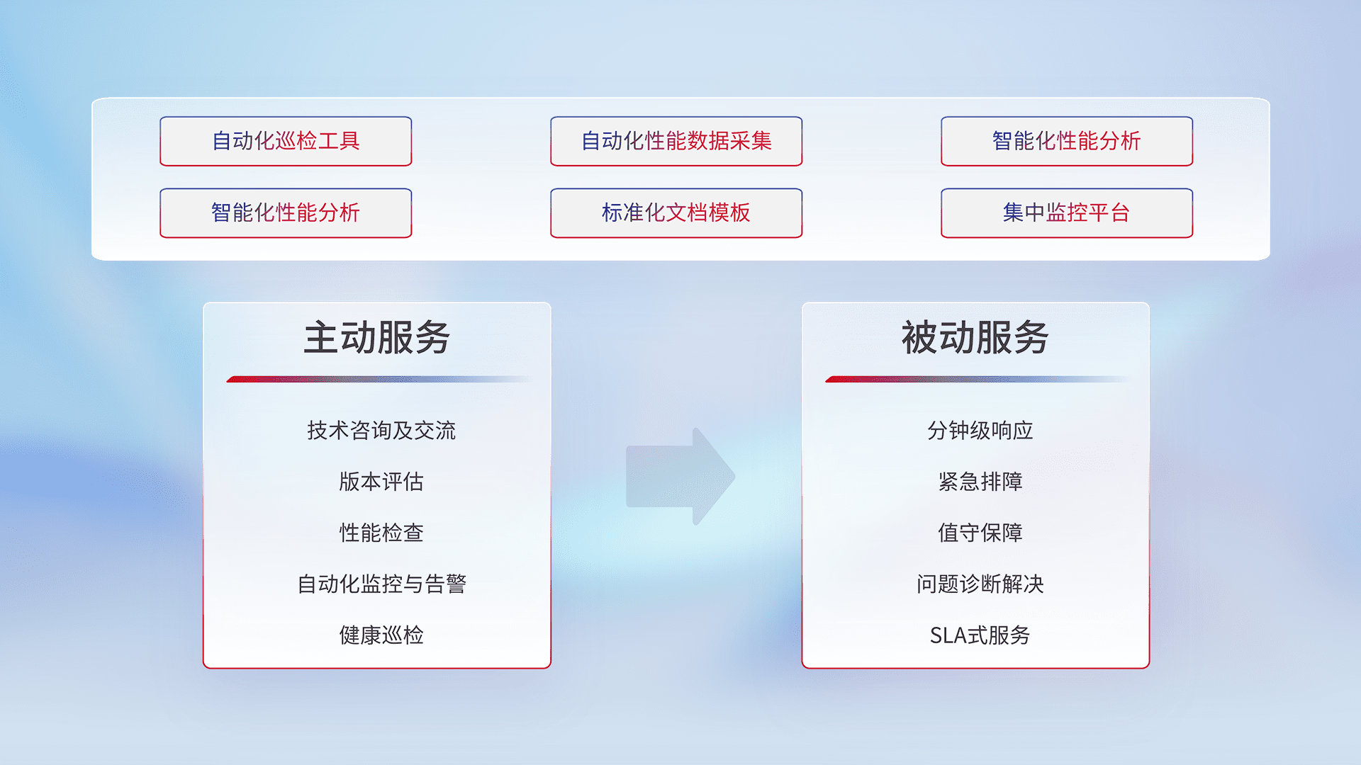 智能化工具和标准化文档,,,保障服务质量,,提供主动服务(包含技术咨询、、版本评估、、、性能检查、、、、自动化监控与告警、、、、健康巡检)和被动服务包含(分钟级响应、、、紧急排障、、值守保障、、、问题诊断解决、、、SLA服务)。。。。
