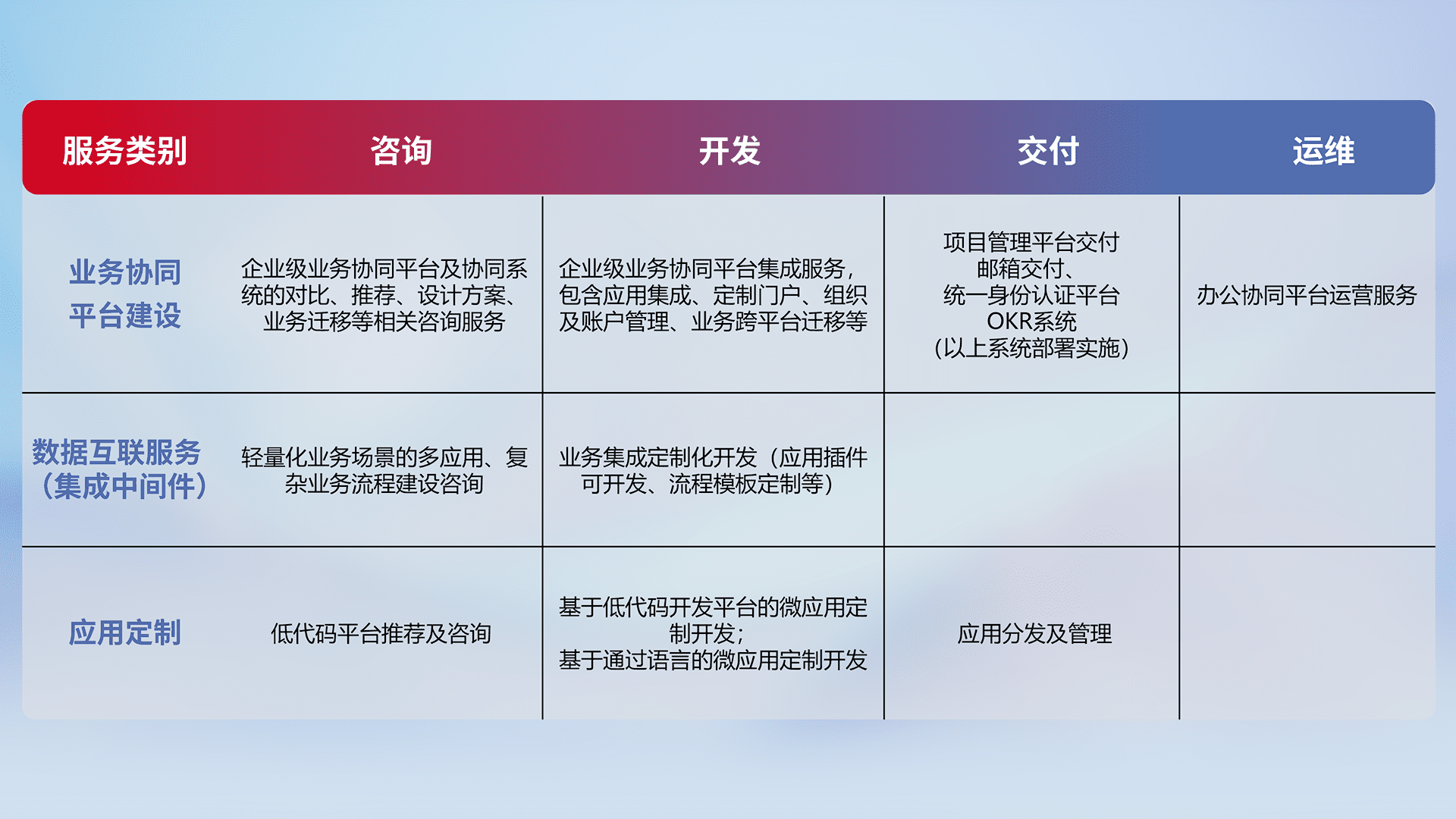 针对钉钉、、、企微、、IDaas等平台级产品提供产品的规划、、方案、、交付、、、、定制化开发等服务,,,,实现如统一协同办公、、、、智能客户服务、、混合会议管理、、、、智能数据查询、、、、等业务场景,,实现数字化转型。。